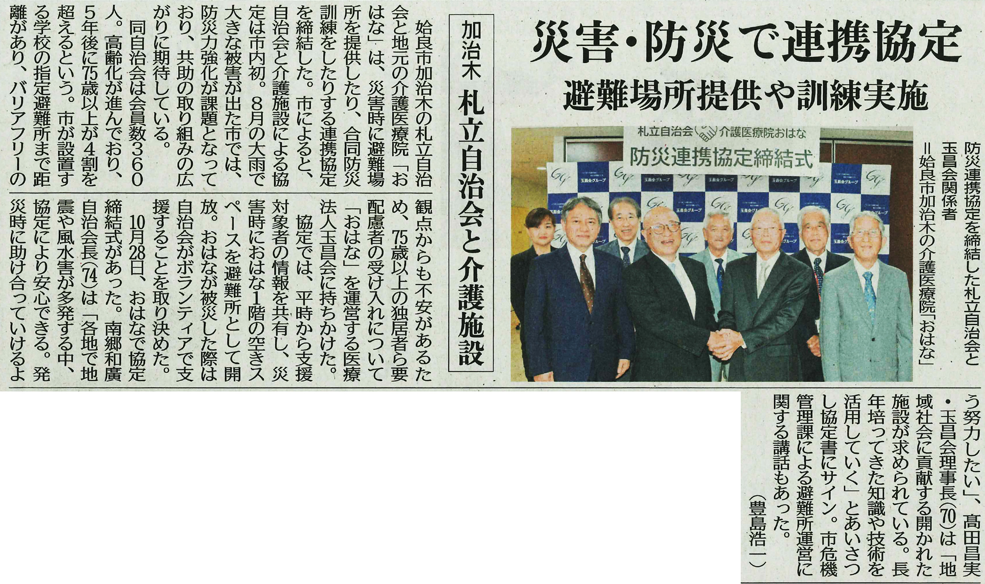 topics南日本新聞に「札立自治会・介護医療院おはな 防災連携協定」の取材記事が掲載されました 玉昌会 法人サイトお知らせメディア南日本新聞に「札立自治会・介護医療院おはな 防災連携協定」の取材記事が掲載されました 2025年11月07日 11月6日付 南日本新聞 地域総合面に、10月28日に介護医療院おはなで執り行いました「札立自治会・介護医療院おはな 防災連携協定 締結式」の取材記事が掲載されました。 ご一読いただけますと幸いです。 2025年11月6日 南日本新聞記事※クリックで拡大します。※掲載にあたり許可をいただいております。